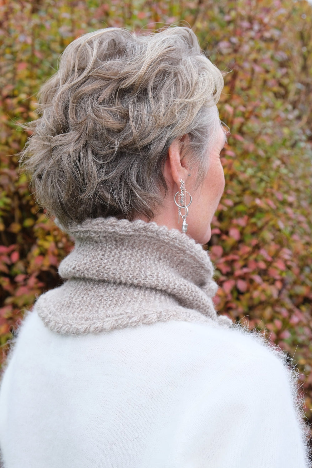 Halsen strikkes i rettstrikk (riller) fram og tilbake på p fra den ene spissen til den andre. Spissene formes ved å øke i starten og felle mot slutten. Ved montering legges den ene enden over den andre, og det hekles en dekorativ boblekant som samler endene til riktig fasong.